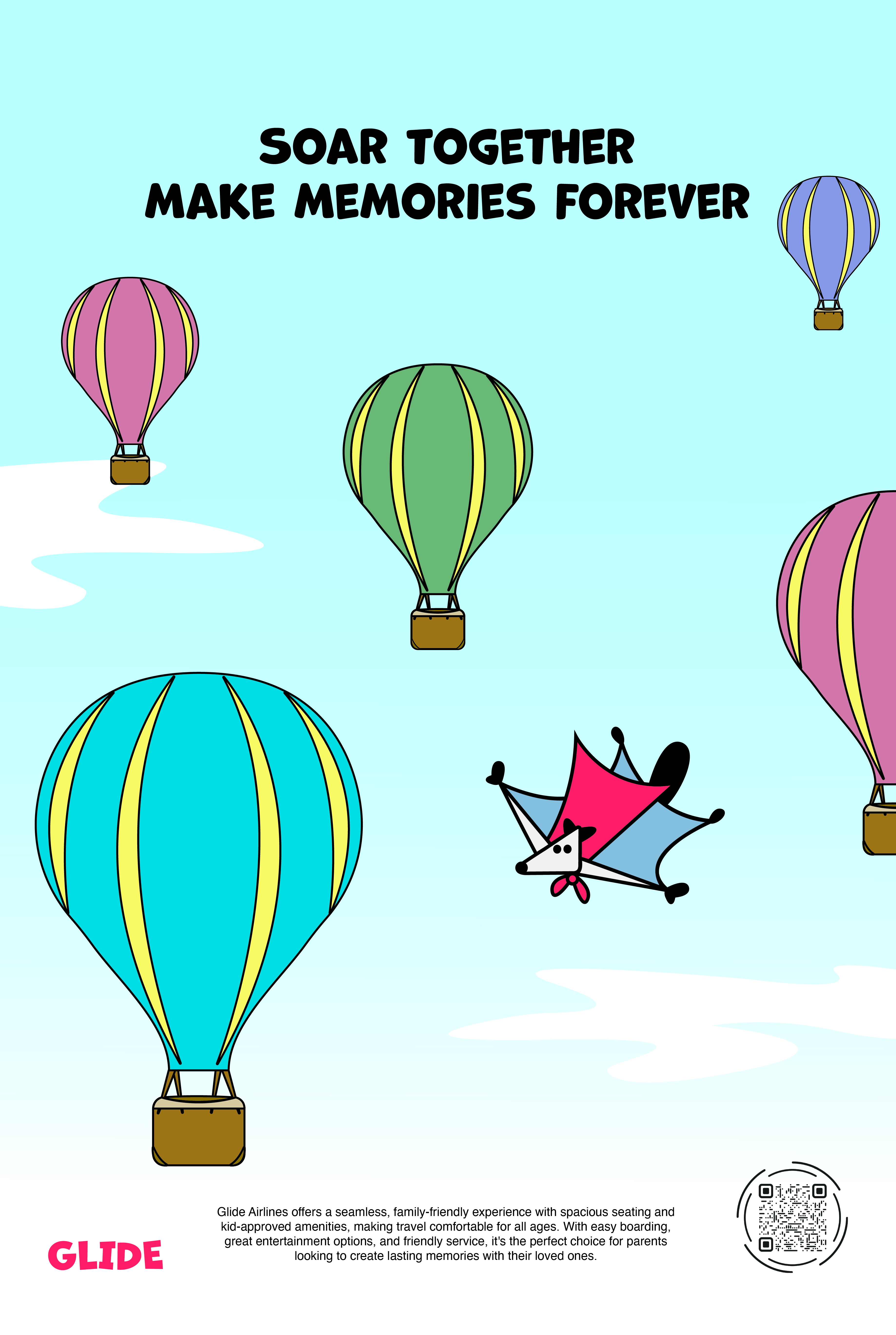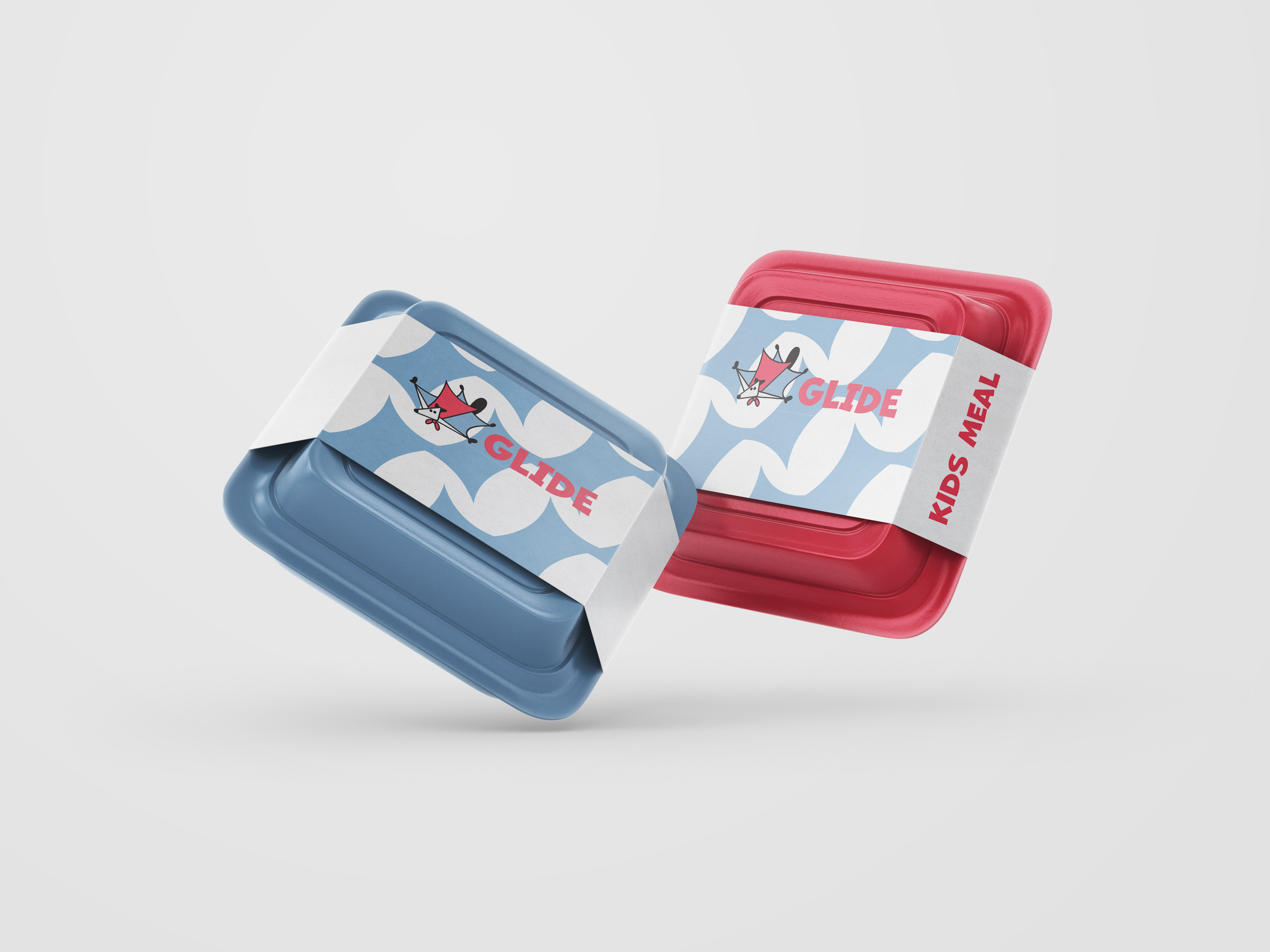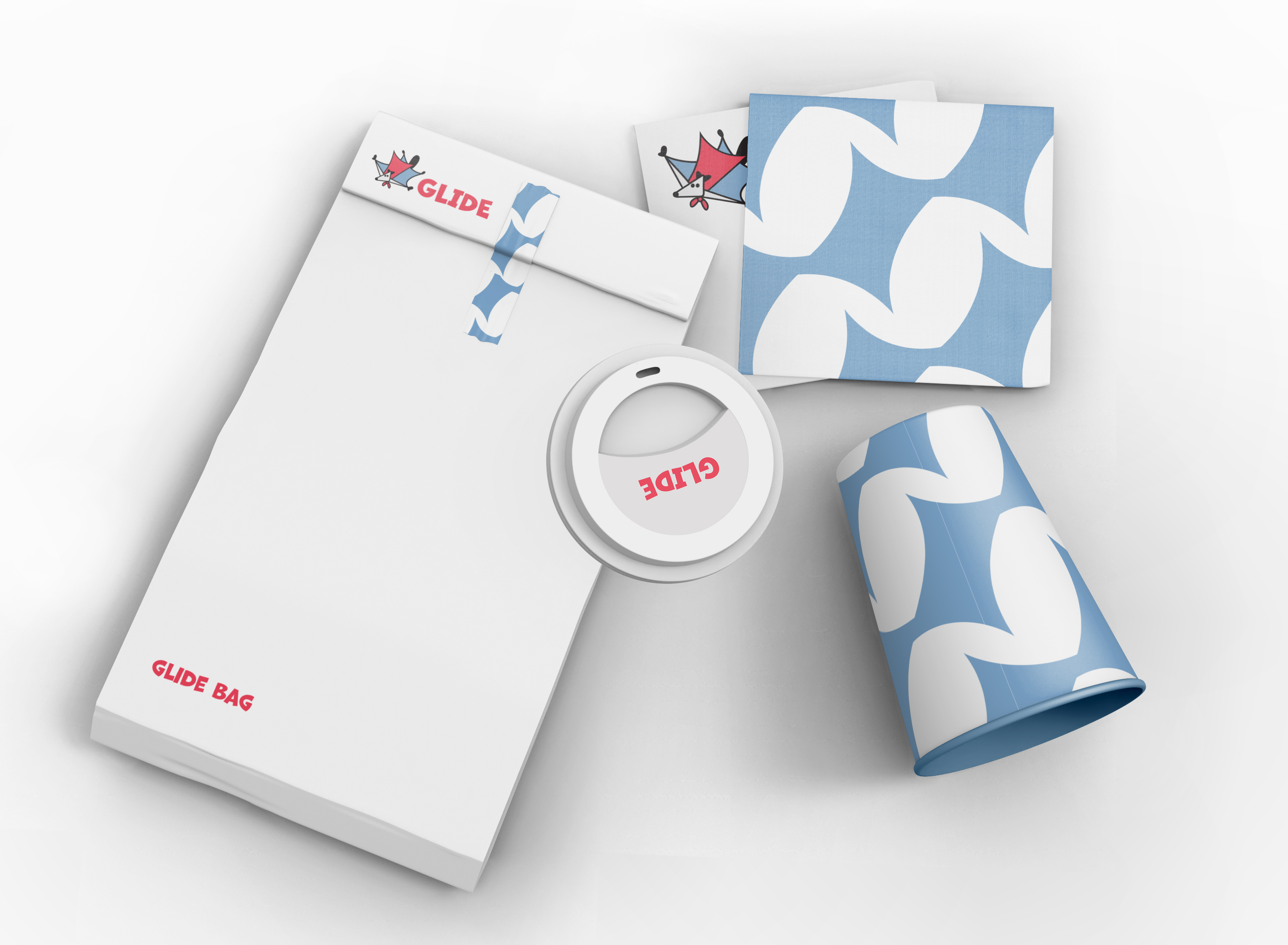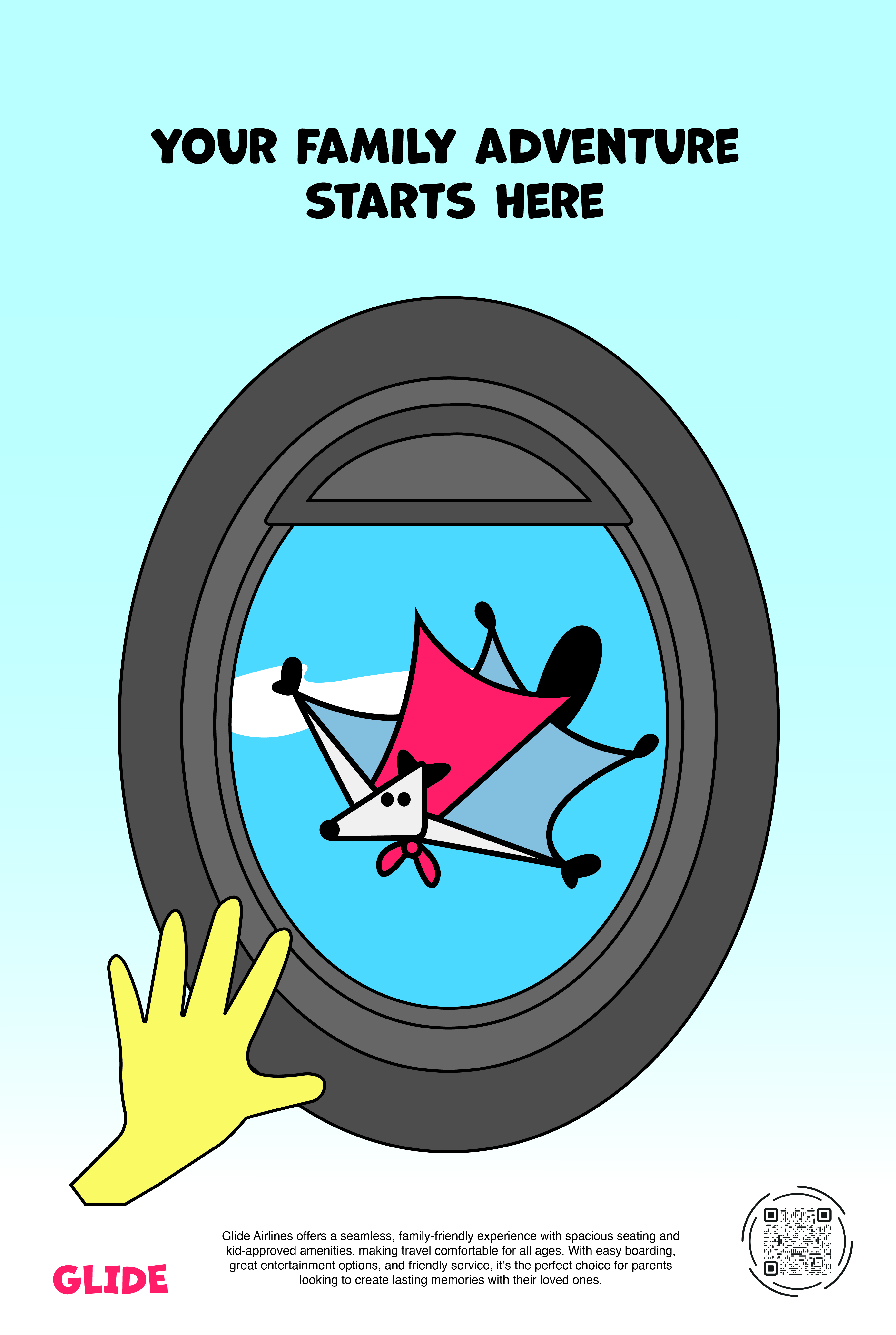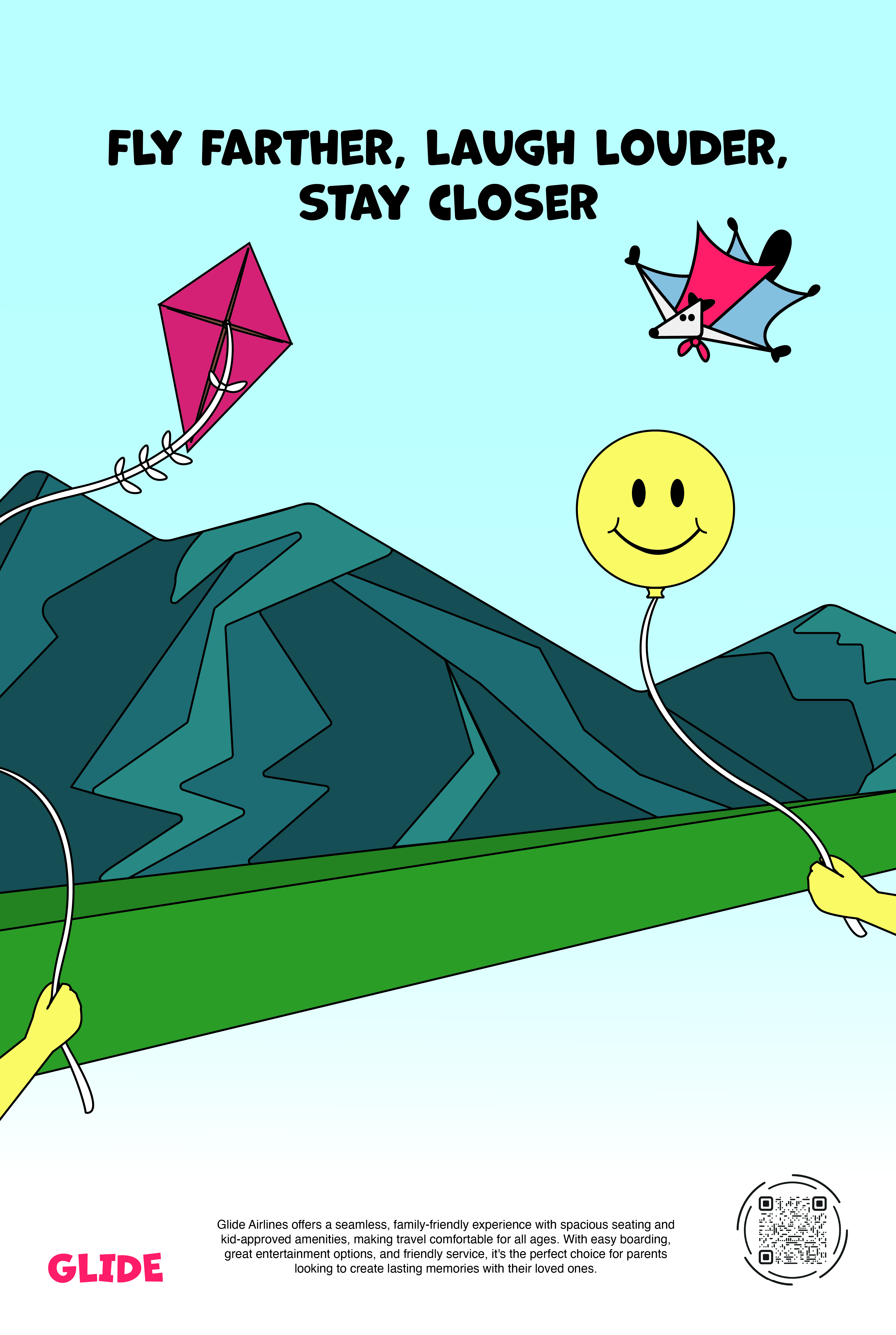 A comprehensive brand identity for Glide, a family-focused airline designed to make flying with kids joyful rather than stressful. The visual system centers on a flying squirrel mascot and soft, approachable illustrations that capture the wonder of flight through a child's eyes. Deliverables included arethe planes, luggage tags, marketing posters, food boxes, a "Glide Airline Kid" pin, and more. All unified by whimsical typography and a cheerful blue, blue, and white color palette.